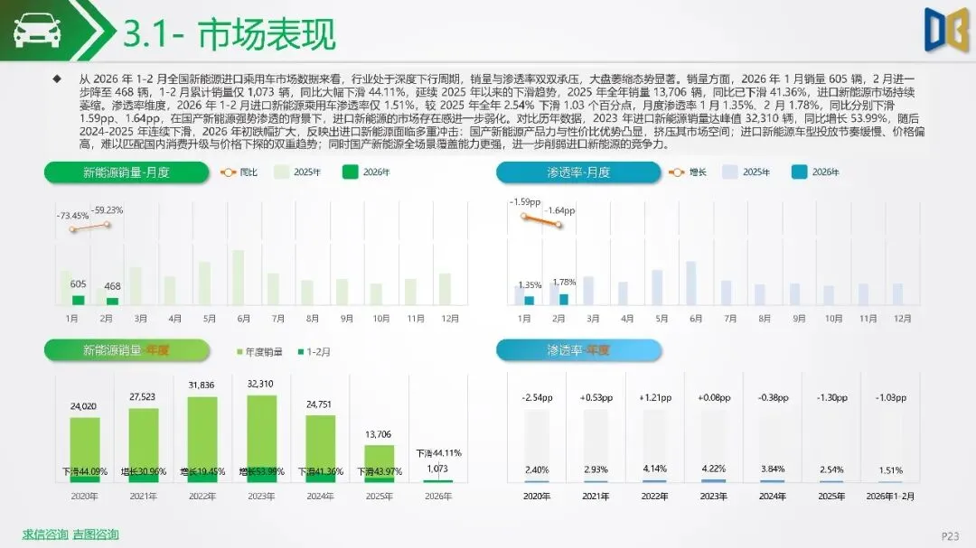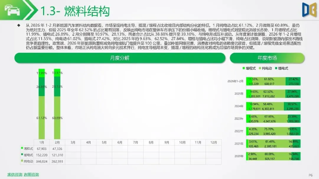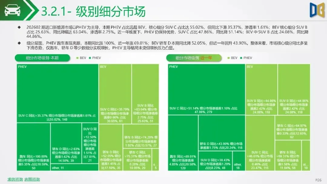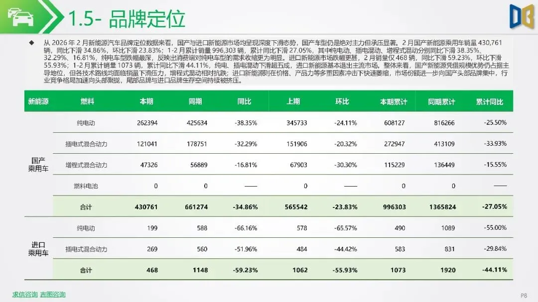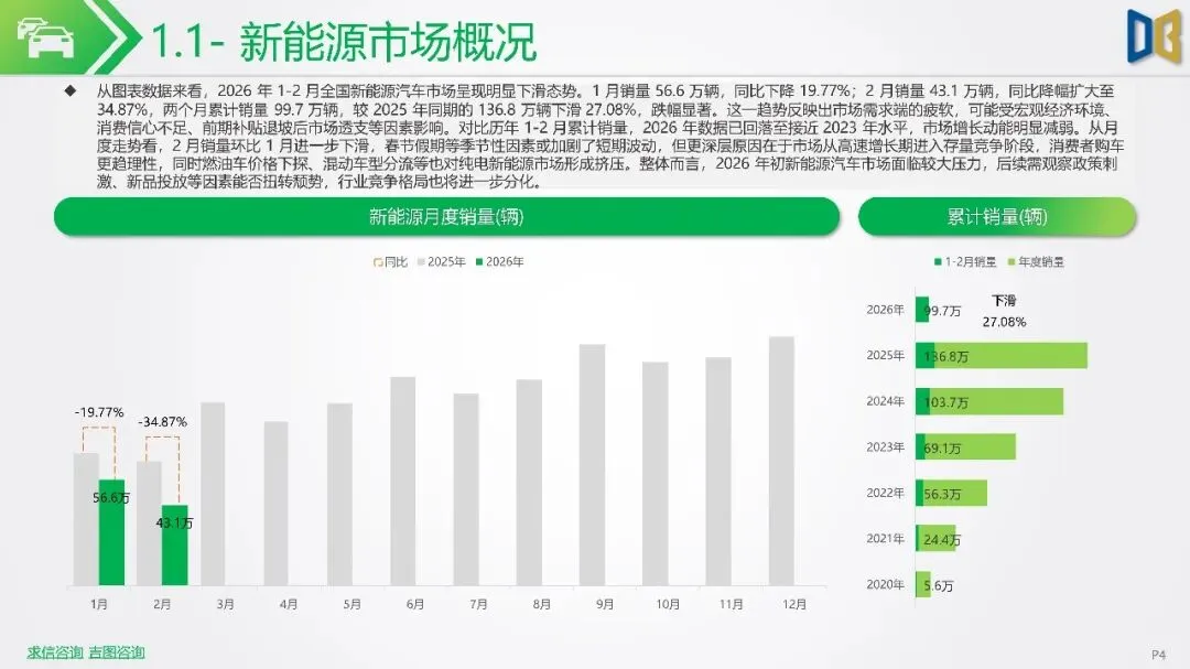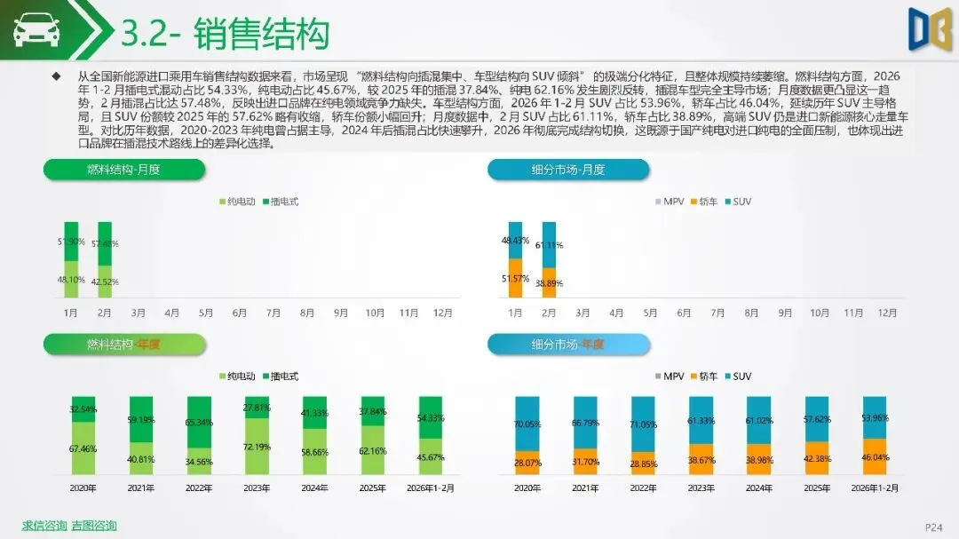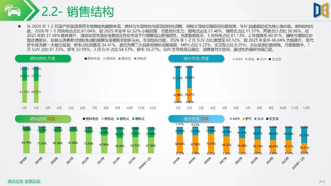 2026年初新能源汽车市场显著下滑,1-2月销量同比降幅扩大,市场渗透率回落,反映出需求疲软及市场进入存量竞争阶段。SUV成为新能源市场核心,占比大幅提升,而轿车增长放缓。国产新能源占据主导,但各技术路线均面临压力,增程式混动相对抗跌;进口新能源则快速萎缩,市场份额向国产头部品牌集中。