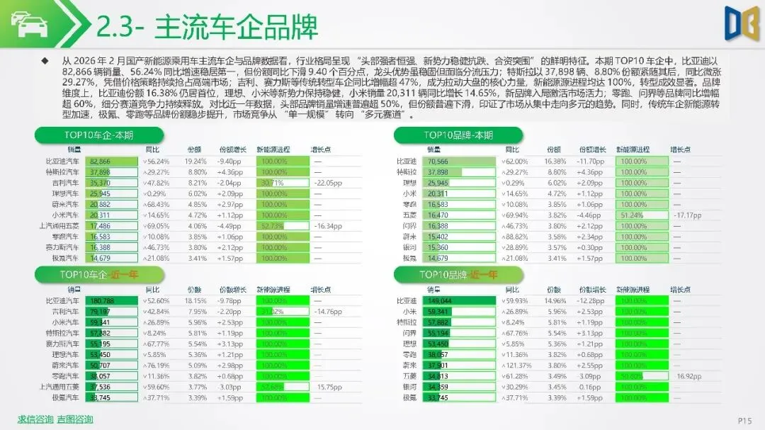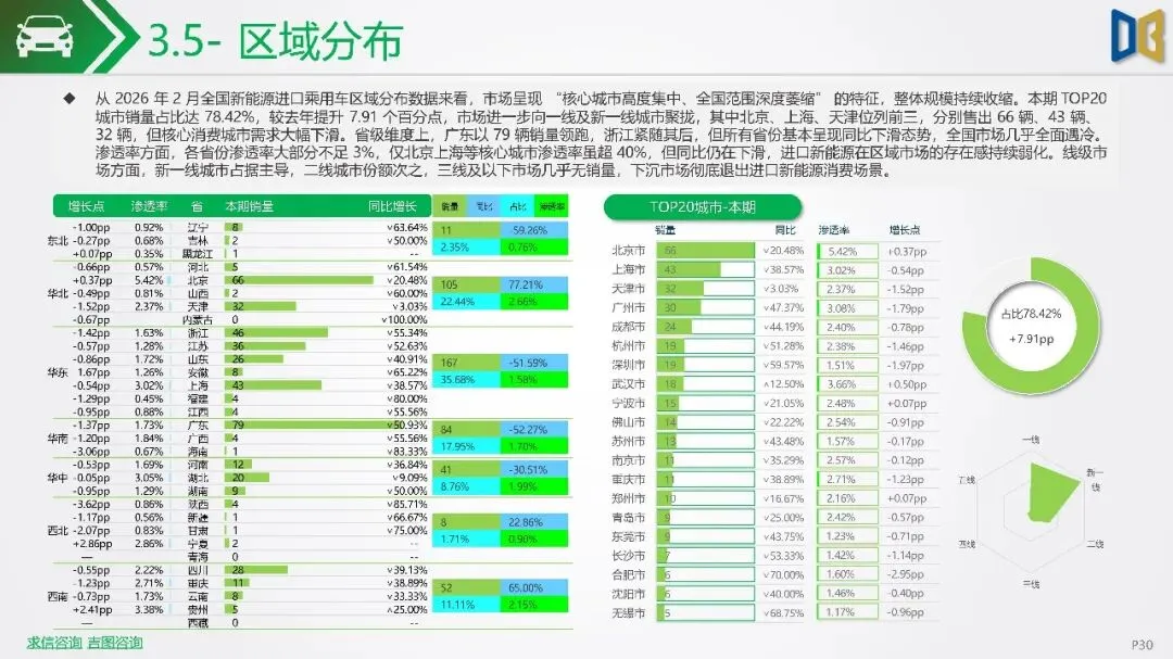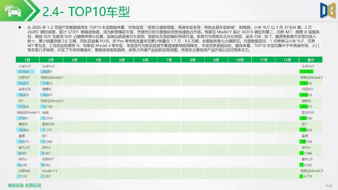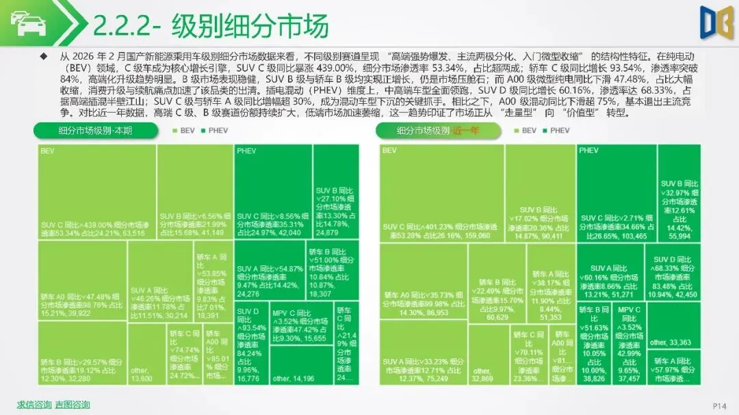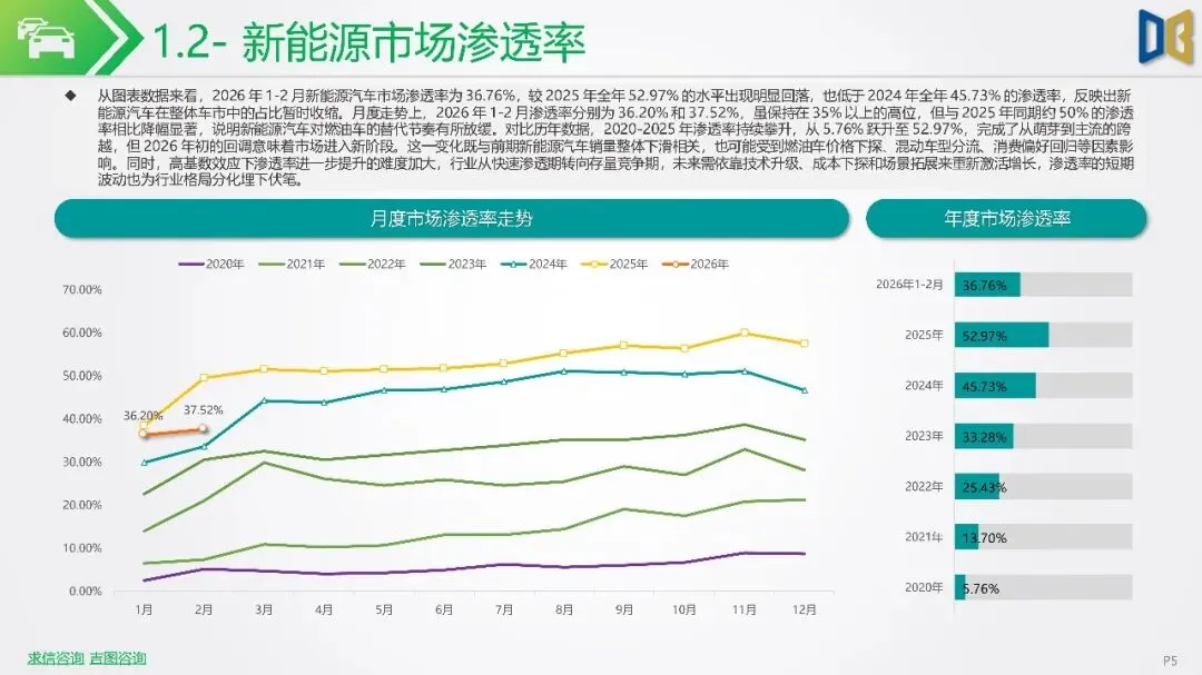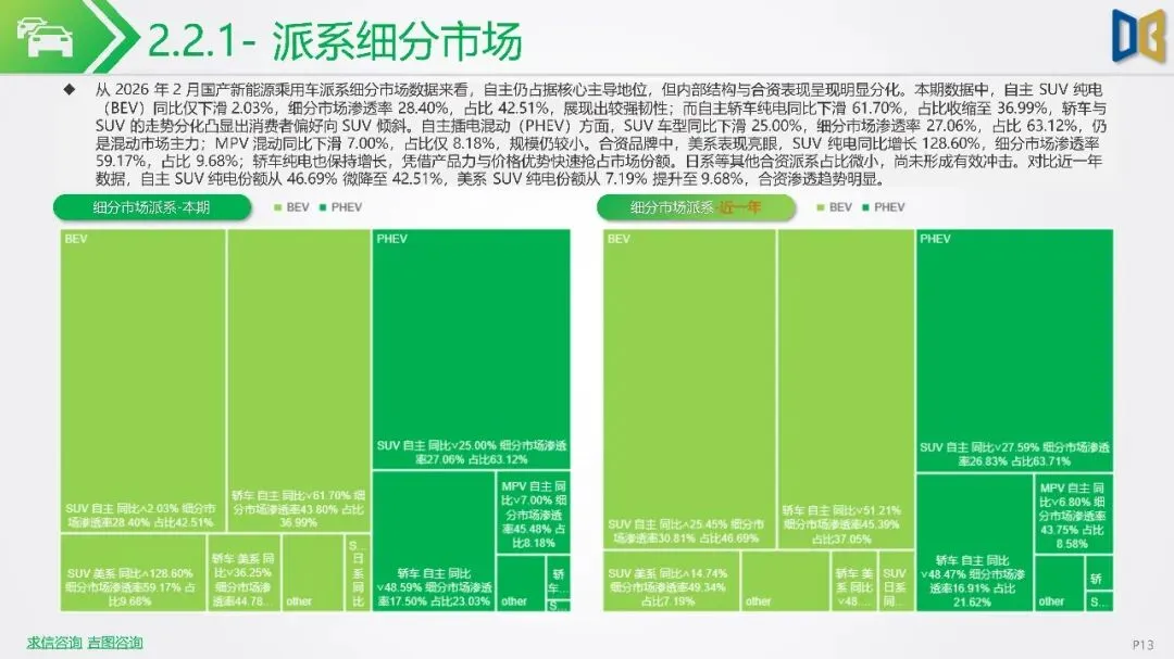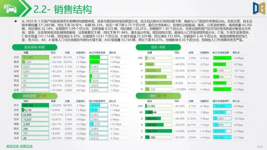 2026年初新能源汽车市场显著下滑,1-2月销量同比降幅扩大,市场渗透率回落,反映出需求疲软及市场进入存量竞争阶段。SUV成为新能源市场核心,占比大幅提升,而轿车增长放缓。国产新能源占据主导,但各技术路线均面临压力,增程式混动相对抗跌;进口新能源则快速萎缩,市场份额向国产头部品牌集中。