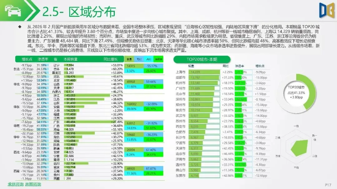 市场呈现高端强势爆发、主流两极分化、入门微型收缩的结构性特征,C级和D级车逆势增长,A00级车大幅下滑。头部品牌销量增速普遍超50%,但份额普遍下滑,市场从集中走向多元。区域市场中,广东等沿海省份销量领先,但同比下滑显著,新疆、海南等小众市场渗透率逆势提升。未来,新能源汽车市场需依靠技术升级、成本下探和场景拓展来重新激活增长。