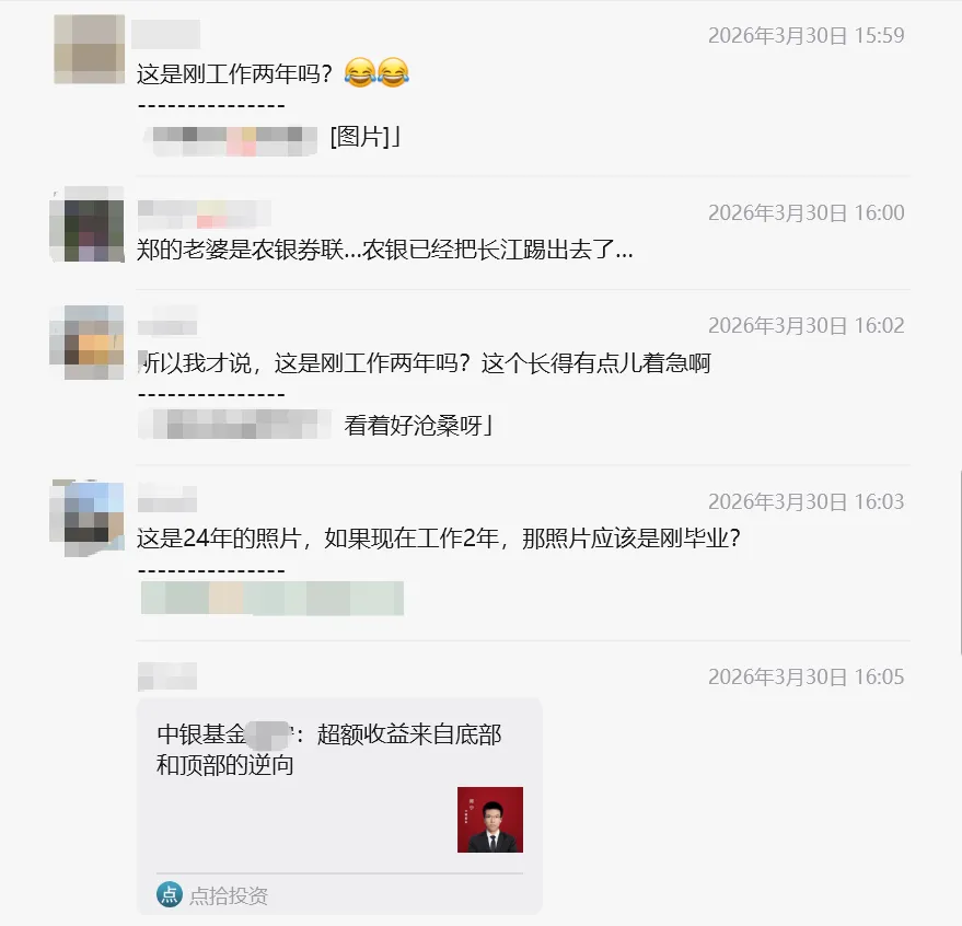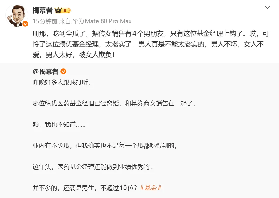 破案,绩优医药基金经理和券商销售的身份被扒基金圈的每一个瓜,都有下文,而且很详细。上一次是基金经理打掼蛋被抓,这次是基金经理和券商销售。3月31日,社交平台有人透露,某医药基金经理跟券商销售在一起的瓜在圈内盛传。然后就有吃瓜群众开始扒了,这个基金经理和券商销售到底是谁,截至午间,男女主的所在公司信息全被“侦探”网友们找出来了。有的业内人士说男主已经从中y基金跳槽去了三字头的基金一哥,但这一信息尚未被证实。不过该医药绩优基金经理被传已离婚,然后与券商女销售在一起的。如果真是这样,其实也不存在道德问题,纯属个人私事。毕竟单身的两方恋爱自由,怀孕也是人家的自由,不该拿来吃瓜。女主被业内人士扒出了照片,被认识她的人证实是长江的销售。可能最近市场太差了,大家需要一些小道八卦来分散注意力。基金圈大V还透露出一些信息,表示了对绩优基金经理的怜惜。当然了对女方的揣测也只是传言,并未被证实。