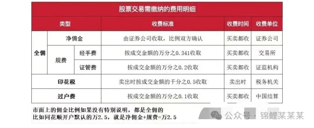 开户前先理清交易成本,除佣金外,其余均为国家/交易所固定收费,无协商空间,佣金是唯一可通过专属渠道优化的部分,且核心要区分「全佣」和「净佣」,这是低佣开户的关键!
