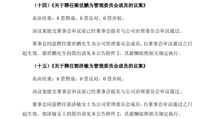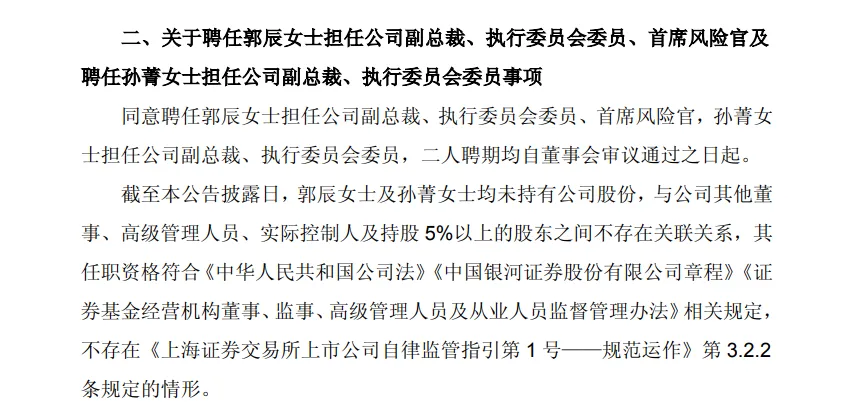 中国银河则同步完成高管补位,因梁世鹏调往中金公司的工作安排调整,其辞任公司执行委员会委员、合规总监、首席风险官等职务。同时,中国银河聘任郭辰、孙菁两位女将出任副总裁、执行委员会委员,其中郭辰同时兼任首席风险官,接替梁世鹏负责风控相关工作。