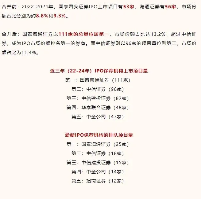 国泰海通合并后,2022-2024年度主导的IPO上市项目数量超百单,远超过去行业龙头中信证券,重塑了行业生态,金融圈行业格局很可能会发生大变化!