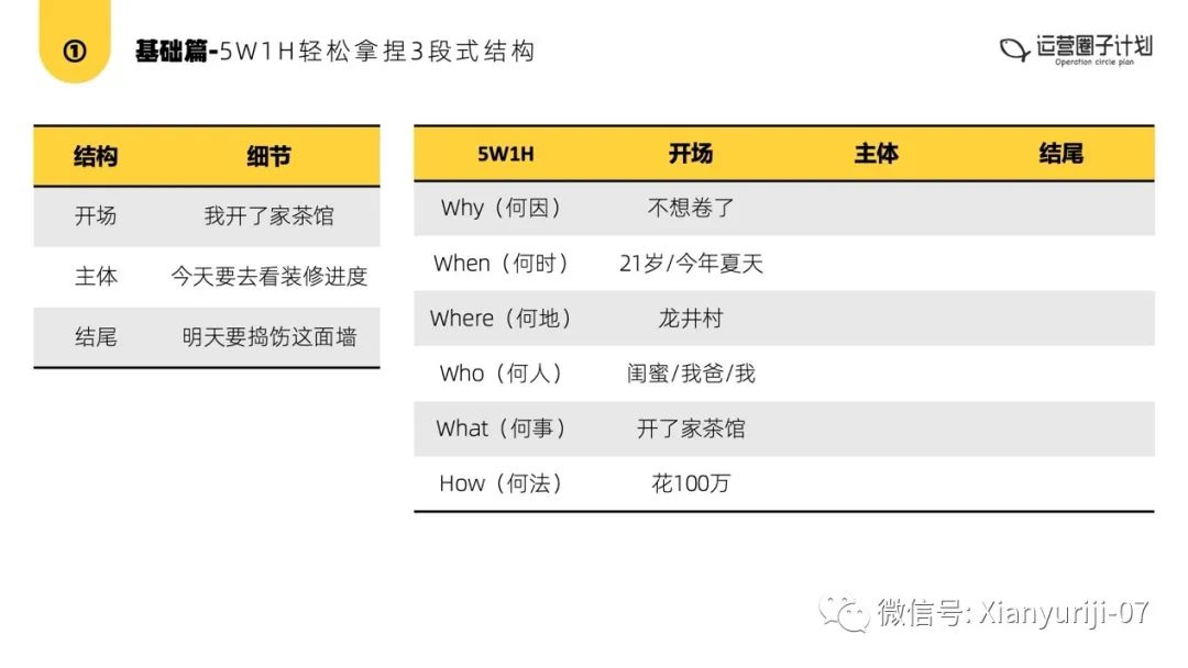 给大家准备了一份表格,大家可以练习一下用5W1H优化开场、主体、结尾。