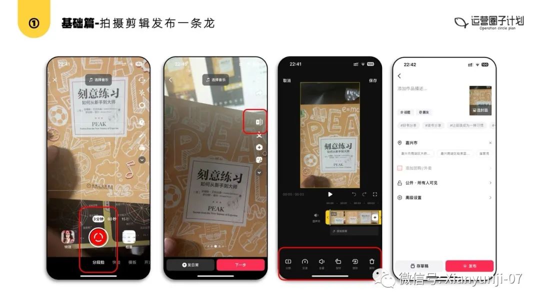 用抖音「分段拍」功能拍摄,用抖音「剪辑」功能剪辑,然后直接在「发布界面」完善文案、标签和定位后直接发布。