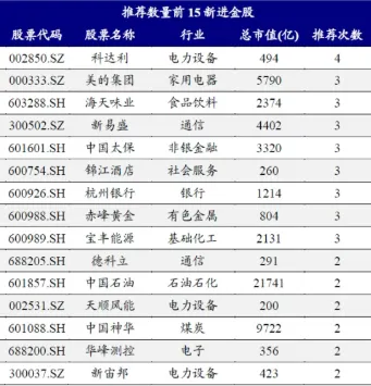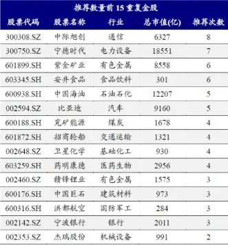 中国海油(600938)、比亚迪(002594)等,合计均被推荐了5次;兖矿能源(600188)、招商轮船(601872)、卫星化学(002648)、药明康德(603259)等,均被推荐了4次。
