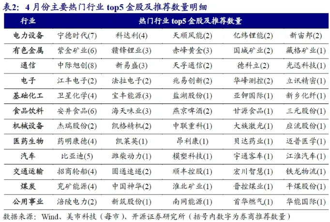 开源证券研报统计结果显示,4月券商金股权重最靠前的行业为电力设备,且占比高达11.8%;有色金属紧随其后,占比为9.1%;通信、电子位居其次,占比分别为7.3%和6.3%。