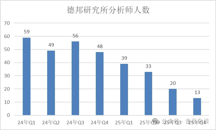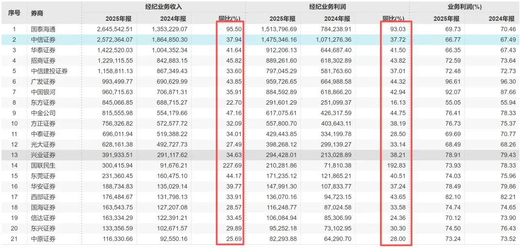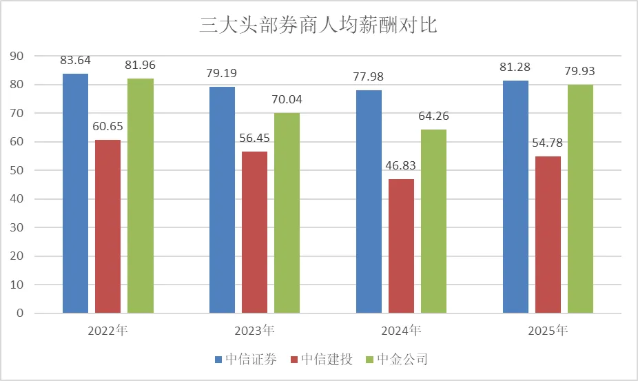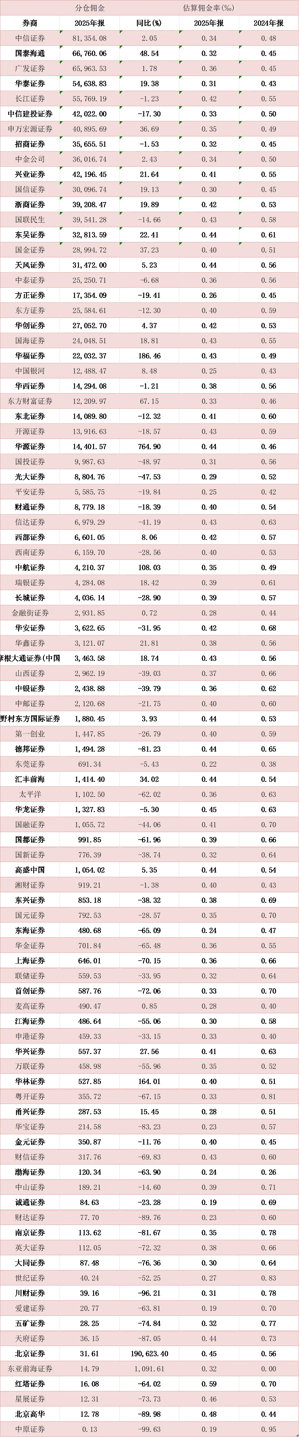 25年券商又出清了8000人!德邦分仓佣金锐减81%,中金人均涨薪24%金石注:由于账号迁移,很多用户标注的星标都失效了,为了第一时间看到文章更新,辛苦大家记得点下星标。4月2日消息,各大券商年报相继出炉,由于不少券商在2025年年报中发生营收或净利润调整,导致第三方数据部分失真,本文以券商研报统计数据作为参考简单说下整体业绩。据开源证券研报,24家上市券商2025年营收同比增加32%,归母净利润同比增加46%,扣非归母净利润同比增加50%;2025年各大券商经纪、投行、资管、利息净收入、投资收益(含公允和汇兑)同比增加44%、38%、 8%、48%以及27%,券商经纪、投行、两融和投资业务均有较快增长。相较于2024年券商有6家利润超百亿,2025年券商归母净利超百亿券商扩容至8家。其中,中信证券净利润300亿,行业居首;国泰海通两家券商合并,利润来到278亿,营收、利润均居于次席;其他超过百亿利润的券商还有华泰、广发、中国银河、招商证券、东方财富、申万宏源。据开源证券研报,境外收入增速成为头部券商亮点。其中,中信证券境外收入增速42%,中金58%,华泰57%,国泰海通229%(合并因素),广发证券100%;中信证券、中金公司、华泰证券、国泰海通、广发证券境外资产增速分别为31%、32%、38%、139%(合并因素)、78%。券商从业人员继续出清,据wind数据,24年Q4有33.8万,25年Q4减少至32.97万,1年时间锐减8000多人;近1年来看,即25年Q2至26年Q2区间则少了6000人,最新券商从业人数为32.4万人。分析师人数并没有明显减少!团跳槽的分析师们,今年少了100多人,但从去年开始计算,分析师人数不仅没有减少,反而增加了;24年年底是5506人,如今5766人,1年多时间分析师人数增加260人。投资顾问人数不断增加,25年Q1至26年Q1增加了6000人;虽然牛市加持,证券经纪业务从业人员大幅出清,从25年Q1的27559人锐减至26年Q1的20939人,1年时间少了近7000人;此外,投行业务减少,保代人数也从8706人减少至26年Q1的8458人,1年减少250人左右。不过,经纪业务人员虽然大幅减少,但是在牛市加持、成交量暴增之下,各大券商经纪业务大爆发,中信证券涨38%,华泰涨41.6%,招商45.82%,中金公司涨47.16%;经纪业务利润也有不少涨了40%以上,比如华泰、招商、广发等。分析师爱上跳槽背后,券商分仓佣金虽保持整体稳定,但不少券商分仓佣金下滑惨重,有的甚至脚踝斩。在头部券商中,申万宏源分仓佣金大涨36.69%至4.09亿,华泰证券增19.38%至5.47亿。不过,中信建投是头部券商中分仓佣金下滑最为严重的券商,同比下滑17.3%至4.2亿,可能和降薪之下多名重磅分析师离职有关;还有国联民生,则可能是因为合并带来的分析师离职潮。还有几家券商分仓佣金下滑剧烈,中金公司收购的信达证券下滑41%;光大证券下滑48%,国都证券、东海证券、红塔证券、渤海证券下滑超60%,首创证券、五矿证券下滑超70%;排名靠前的券商中,分仓佣金下滑最大的是德邦证券,剧烈下滑81%至1494万。近期,金石杂谈曾发文,德邦证券分析师流失严重,目前只有8名分析师了,近些年该公司的业绩也是在盈亏边缘挣扎。其他分仓佣金下滑惨烈的还有:川财证券96%,中原证券99%,也就是说这些券商的研究所已基本名存实亡。券商分仓佣金极剧下滑背后:1)公募佣金费率改革是主因,券商派点天花板得以明确。从行业规模来看,分仓佣金已经从2021年220亿元的峰值,一路下行到2025年的105.7亿元,短短四年缩水超过一半,彻底告别了过去的佣金红利时代。目前的券商佣金率已彻底从22年峰值的万八降至目前的0.30‰—0.45‰区间。2)除了公募佣金费率改革,还有就是一些研究所主动求变,分析师们不断跳槽寻找新的下家,这往往导致一个结果:不少研究所团队人员流失严重,没有分析师又何谈派点,何谈分仓佣金。3)整个行业都在降本增效,业绩好了薪资没涨成为常态;而且,一些券商利润增加背后,本身就是降本增效、券商裁员、裁撤分支机构的结果。各大券商薪酬陆续出炉,但鉴于wind数据相关数据尚未更新,蹩脚版的薪酬如下。此前金石杂谈发文,一些合并券商的薪酬存在虚高,而还有一些券商只计算了应付职工薪酬,而未进行严谨计算,也不合适。其中,比较靠谱的几家薪酬如下:中信证券81.28万,中金公司79.93万,华泰证券66.92万,广发证券77.25万,中国银河61.61万,招商证券55.49万,中信建投54.78万。本文以中信证券和中信建投为例,进行简单归纳,很明显,中信建投已被远远拉开差距。其中,中信整体薪酬保持稳定,一直下滑不明显,如今人均薪酬再度回到80万上方。中金公司薪酬在连续三年下滑后,今年大幅反弹,人均薪酬涨了24.39%;中信建投薪酬则被甩出头部券商薪酬范畴,2025年也迎来薪酬反弹,人均54.78万,人均薪酬涨了17%。不过,2025年中金公司和中信证券一直被传出不少员工离职。金石杂谈查询wind数据一些主流券商发现,中信证券25年员工是净增加的,中金公司确实流失了不少员工,wind数据显示一年少432人,还有招商证券、兴业证券等减少600多人,中信建投减员400多人。