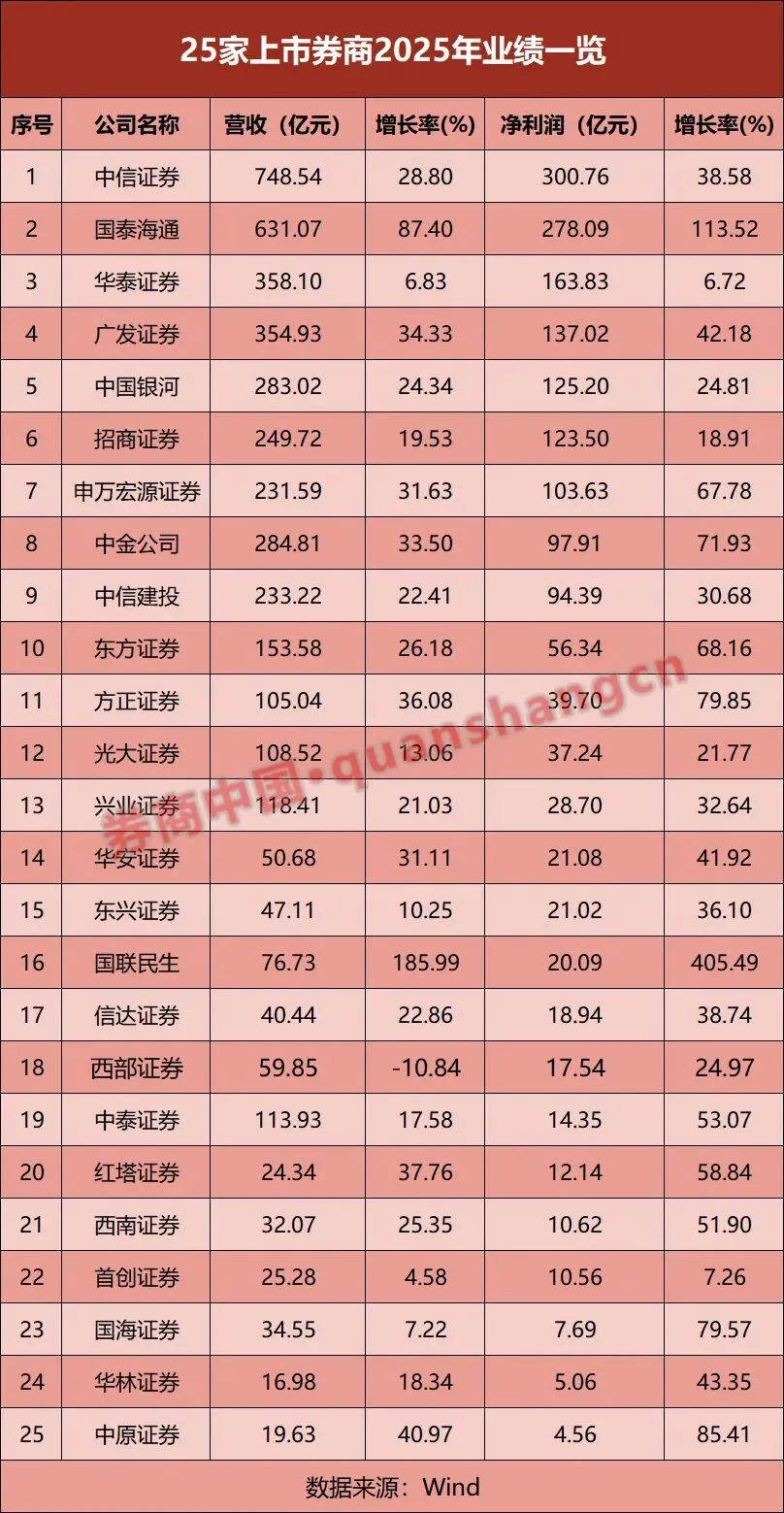 在资本市场活跃度稳步提升的背景下,上市券商2025年年报亮点纷呈。除西部证券营收下滑,其余24家券商均实现营收与净利双增,归母净利润同比增幅最高可至405.49%,最低为6.72%。