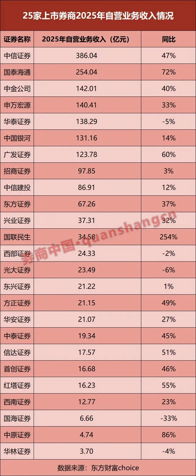 作为重资本业务,券商自营业务考验投资能力,也是资本实力的较量。收入规模角度,中信证券与其他券商拉开较大差距,2025年自营收入为386.04亿元,比第二名国泰海通还多了132亿元。