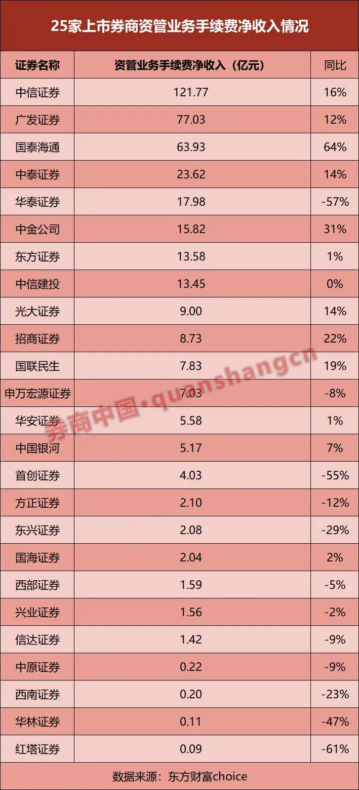 相比前述业务,资管业务收入表现算不上强劲,且分化十分明显。25家上市券商中,13家券商实现资管业务手续费净收入增长,12家下滑。