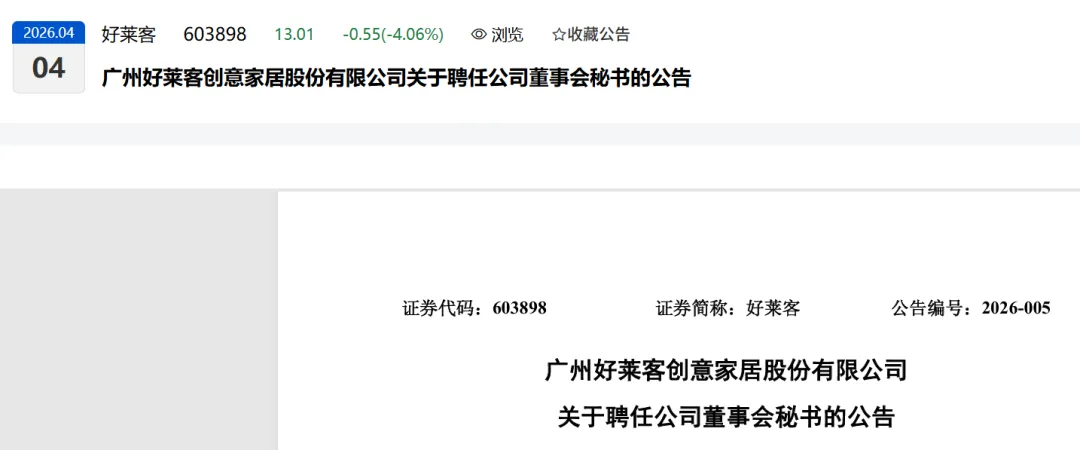 根据《公司法》《上海证券交易所股票上市规则》《公司章程》等相关规定,经广州好莱客创意家居股份有限公司(以下简称“公司”)董事长提名及董事会提名委员会审核通过,公司于2026年4月3日召开的第五届董事会第二十六次会议审议通过了《关于聘任公司董事会秘书的议案》,同意聘任詹程浩先生为公司董事会秘书(简历详见附件),任期自本次董事会审议通过之日起至第五届董事会任期届满之日止。