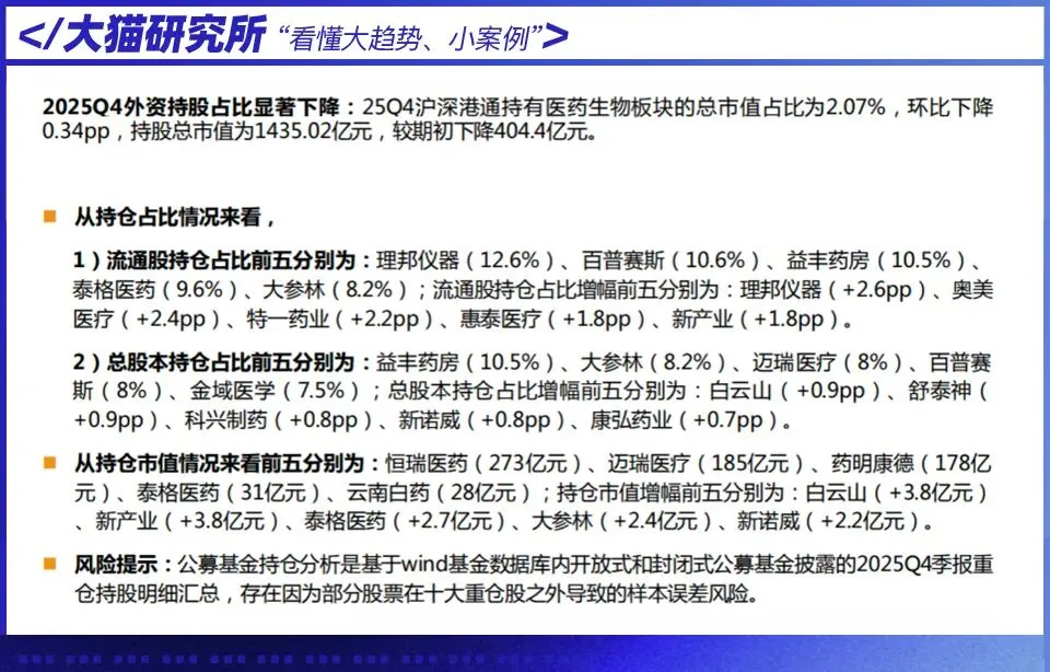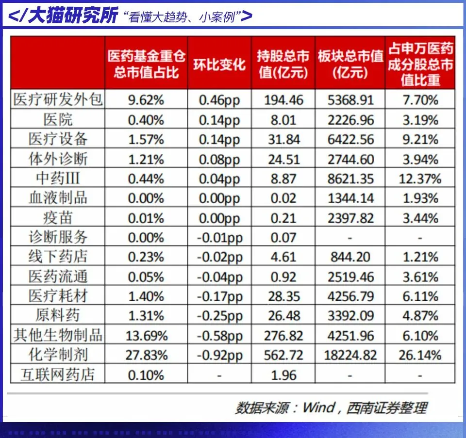 去年后半年,化学制剂和其他生物制剂的持仓在降低,最近一两个季度内,医疗研发外包在增长。