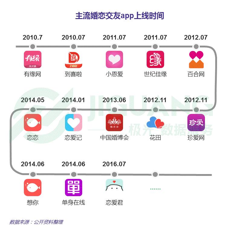 2010年,有缘网推出移动端app;2011年,小恩爱和世纪佳缘app上线;2012-2014年,百合网、珍爱网、花田、恋爱记等婚恋交友app相继出现