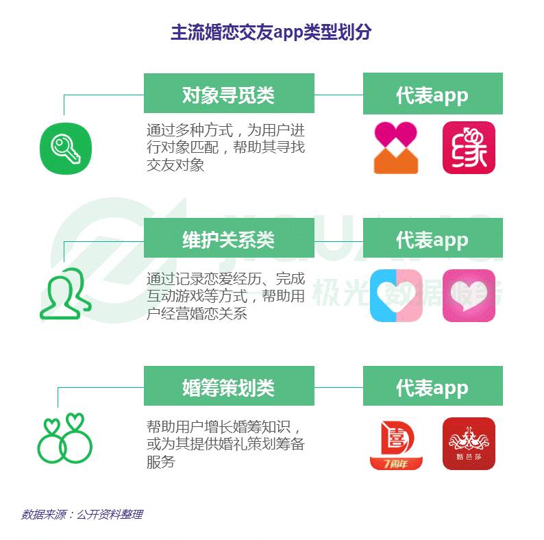 目前婚恋交友app主要可分为三类:对象寻觅类、维护关系类、婚筹策划类