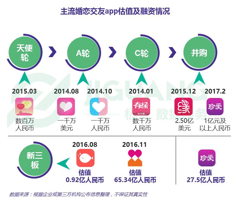 2014年11月,小恩爱、恋爱记完成A轮融资,有缘网完成C轮融资;2015年3月,想你完成天使轮融资,12月,世纪佳缘被并购;2017年2月,珍爱网被并购