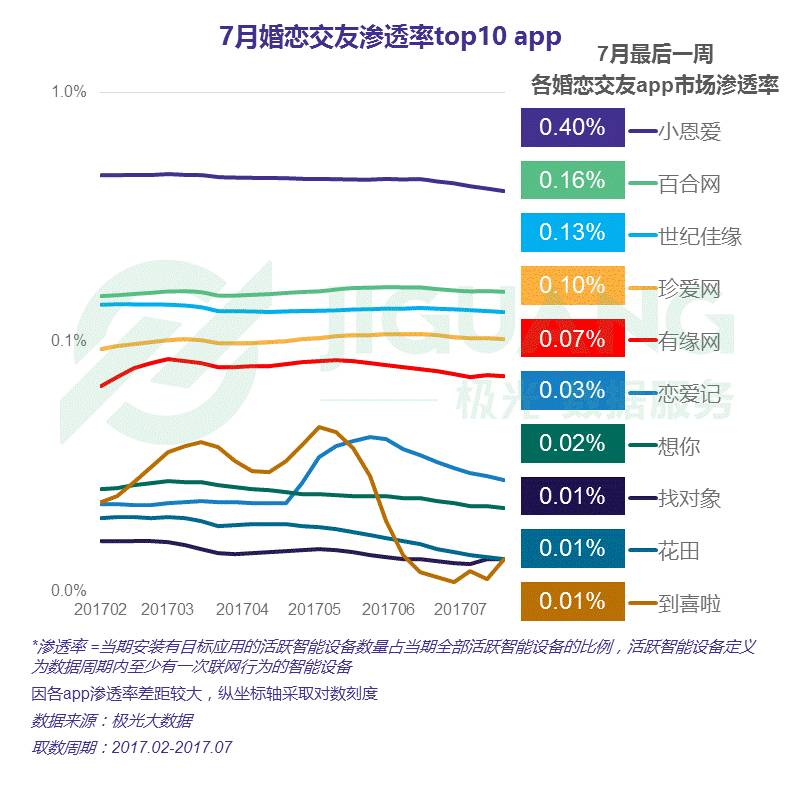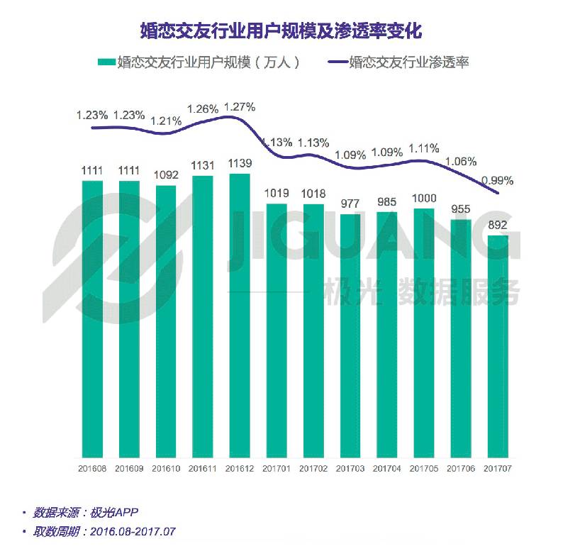 截至2017年7月,婚恋交友市场渗透率为0.99%,用户规模约为892万