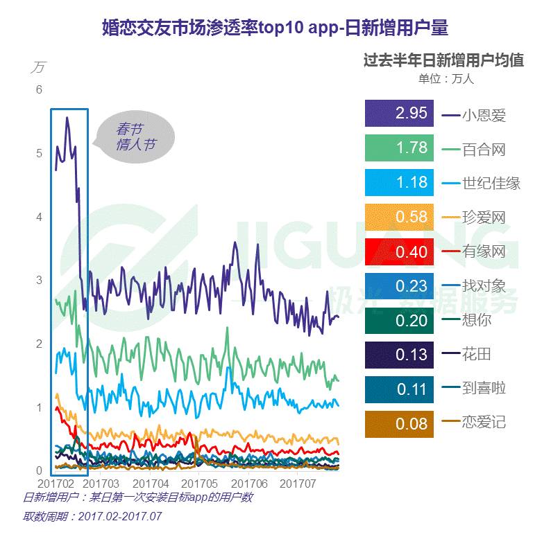 通过观察极光大数据发现,小恩爱过去半年日新增用户均值达到2.95万,百合网为1.78万,世纪佳缘为1.18万