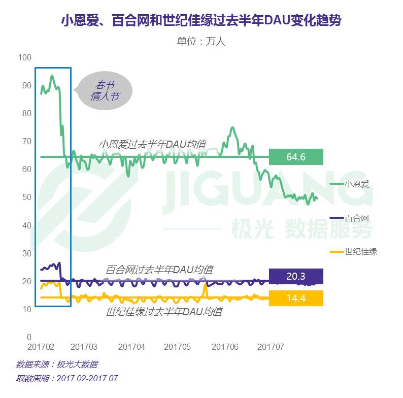 2017年2月至2017年7月,小恩爱DAU均值约为64.6万,百合网约为20.3万,世纪佳缘约为14.4万