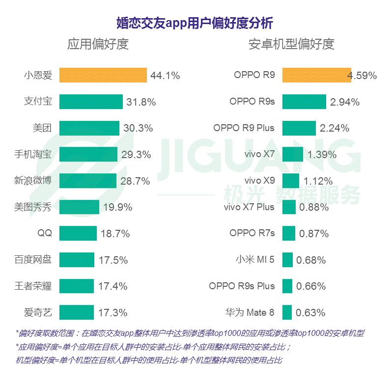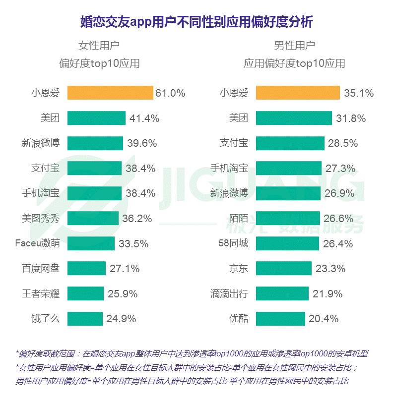 极光大数据显示,婚恋交友用户偏好度前三位应用为小恩爱、支付宝和美团