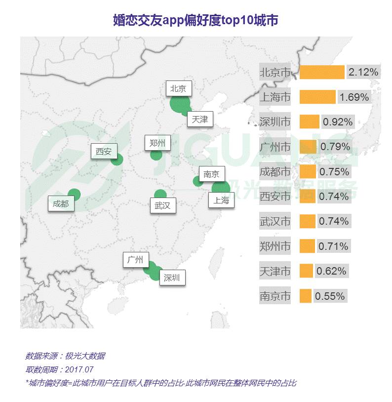 根据极光大数据统计,北京网民对婚恋交友app偏好度最高,偏好度为2.12%
