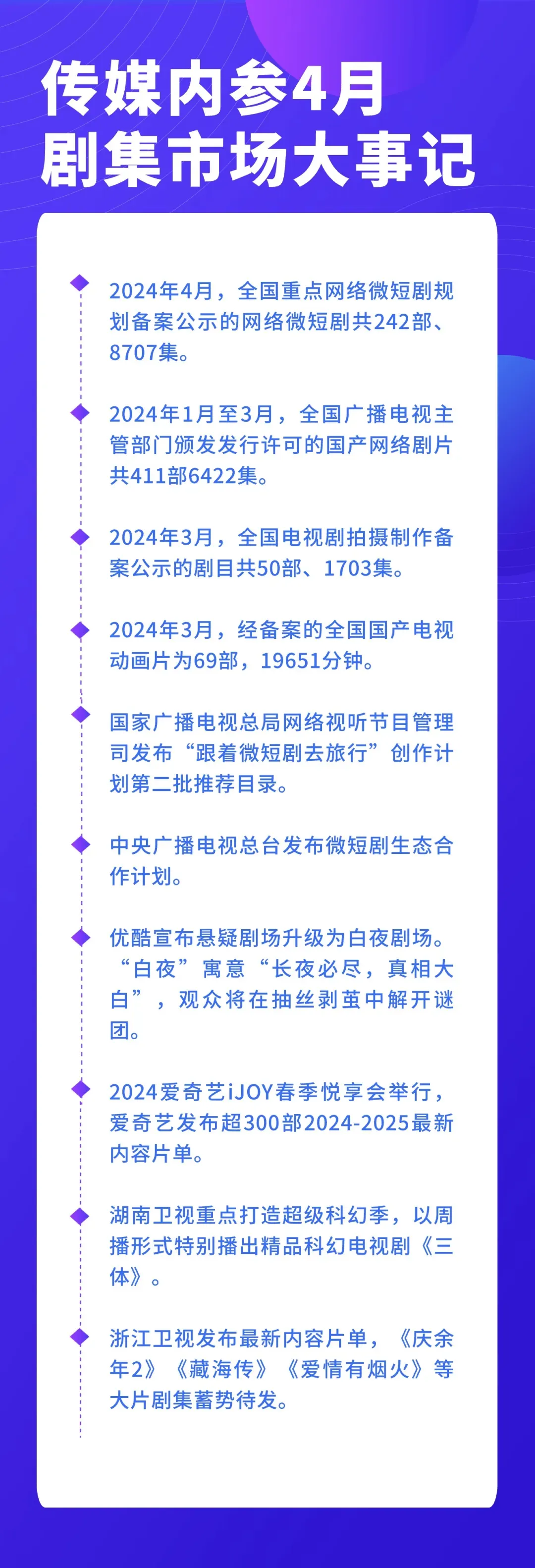 主编温静导读:从题材上看,4月剧集市场: ——都市题材诠释“中国式家庭”特有情感,折射现实,观照当下; ——悬疑题材深入社会议题,探究复杂人性,类型化程度高; ——谍战题材多重悬念密集反转,谍战+模式极具戏剧空间; ——职场题材触角更加聚焦,行业更加细分,也越来越真实; ——古装题材以女性视角展开生活化叙事,强调人物命运。 从剧场化运营来看,优酷推白夜剧场,爱奇艺推出大家剧场、微尘剧场,精细化、同类化、矩阵化成为各平台剧场运营的主要逻辑。