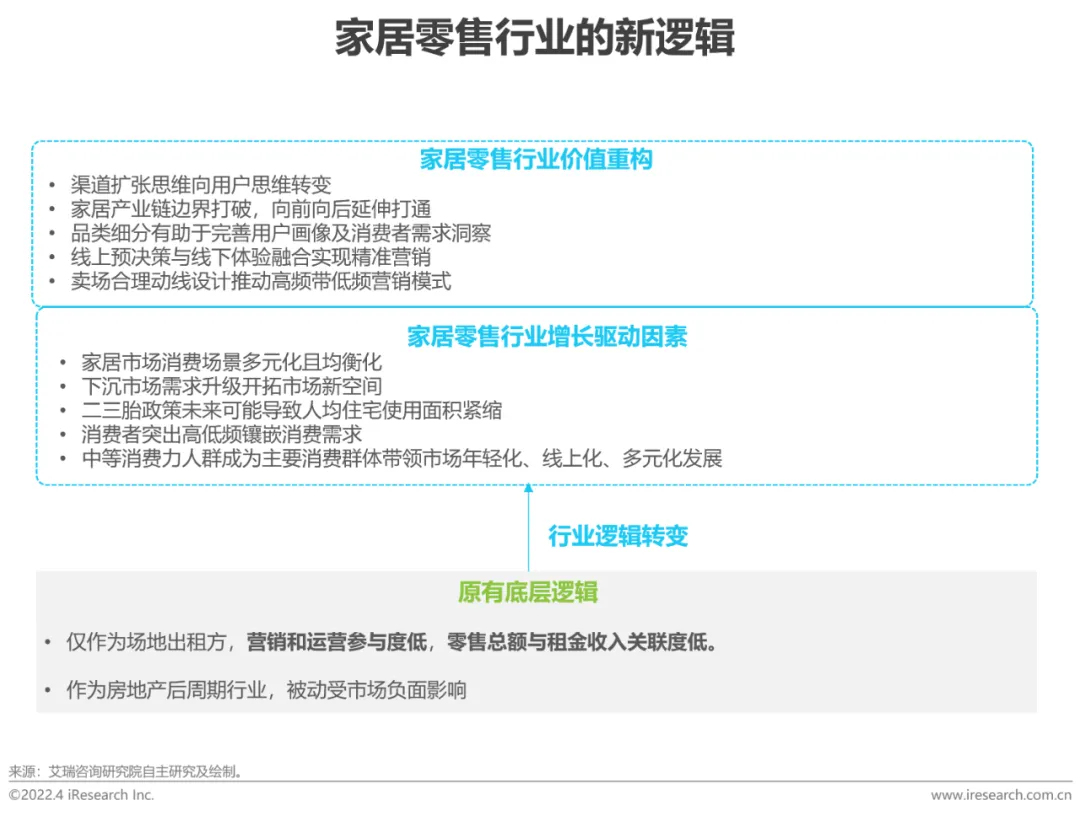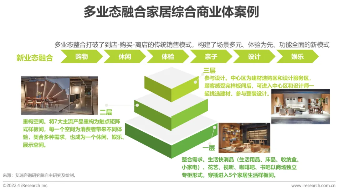 受疫情冲击,家居卖场线上线下深度融合,商场转型升级为多元化沉浸式购物场景集吃喝玩乐多业态融合的综合体成为新趋势,升级互利供需双方。对于消费者而言可以在综合体业态环境中提升生活体验、所需所感一应俱全;对于卖场供给方可以凭借一体化综合形式打响品牌力,通过场景化带动消费低频变成中频和高频,实现精准营销、不出圈买全部的美好愿景。