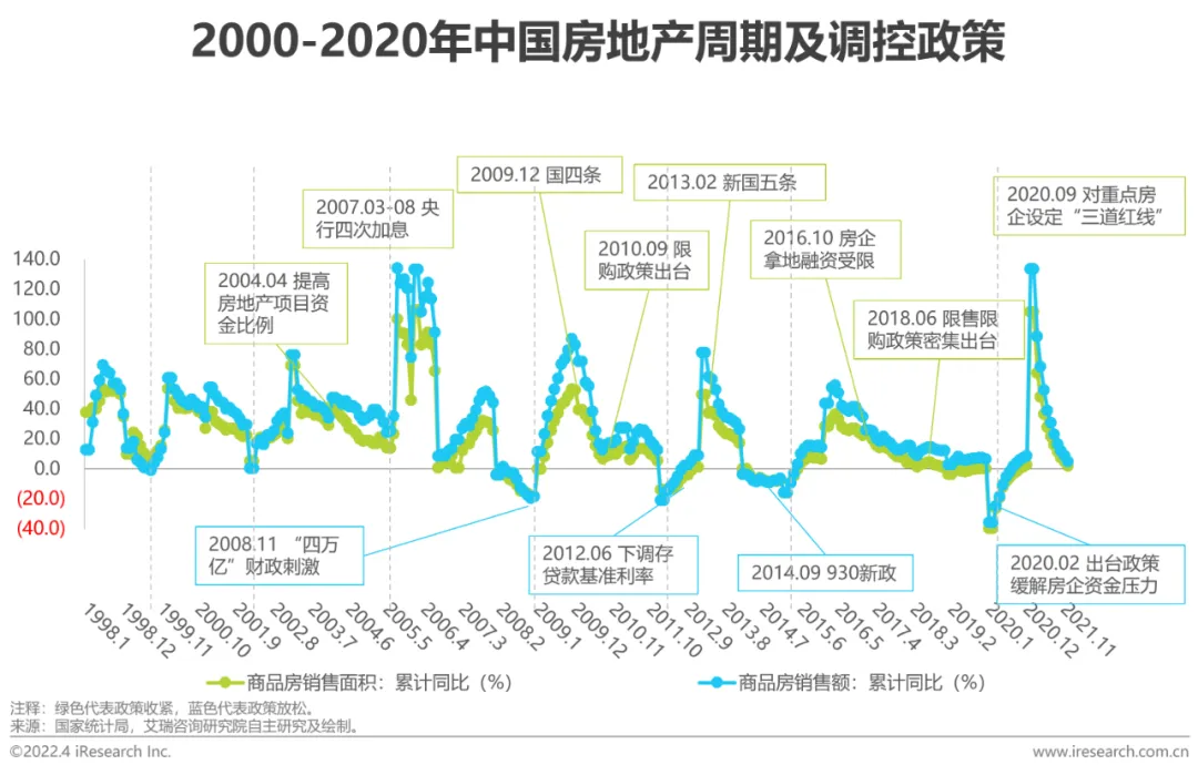 作为家居行业上游的房地产在21世纪初的20年间经历了6次完整的周期。其中,2000-2015年间出现了5个为期2-4年的房地产周期,但是2015年开启的房地产周期持续时间明显拉长,下行压力较大。此外,房地产行业历次逆周期调节表明,政府根据房地产市场的景气程度有针对性地采取宏观调控政策,中国房地产行业的周期性更多地表现为调控政策的周期性。