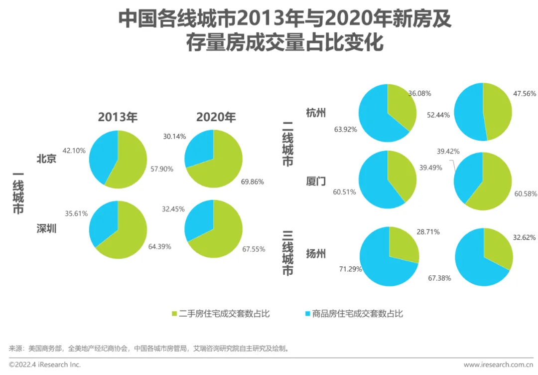 近10年来,美国新房与存量房销售比例维持在大约1:9的水平上,存量房翻新带来的装修需求稳定,与房地产周期性波动的关联性较弱;2013-2020年,中国各线城市房地产交易结构总体表现为新房成交占比下降,存量房成交占比上升,但是在结构性变化的步伐上出现分化:一线城市存量房交易占比接近70%,进入存量房时代,二线城市大多达到50%-60%的水平,三线城市在1/3左右。