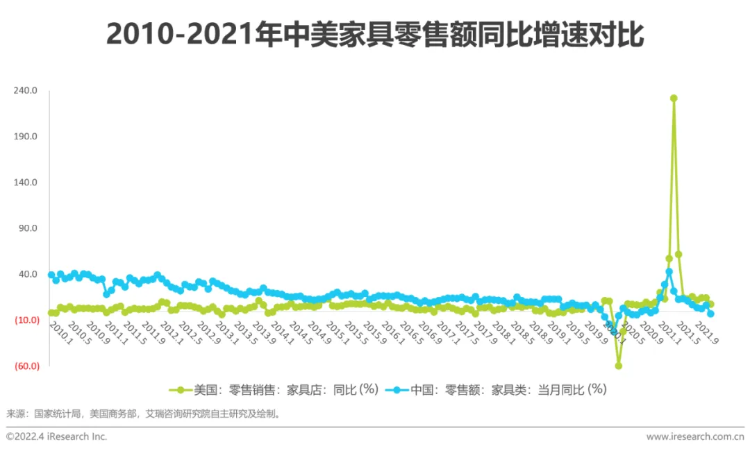 美国家具零售十年来平稳增长,未来中国市场有望趋同
