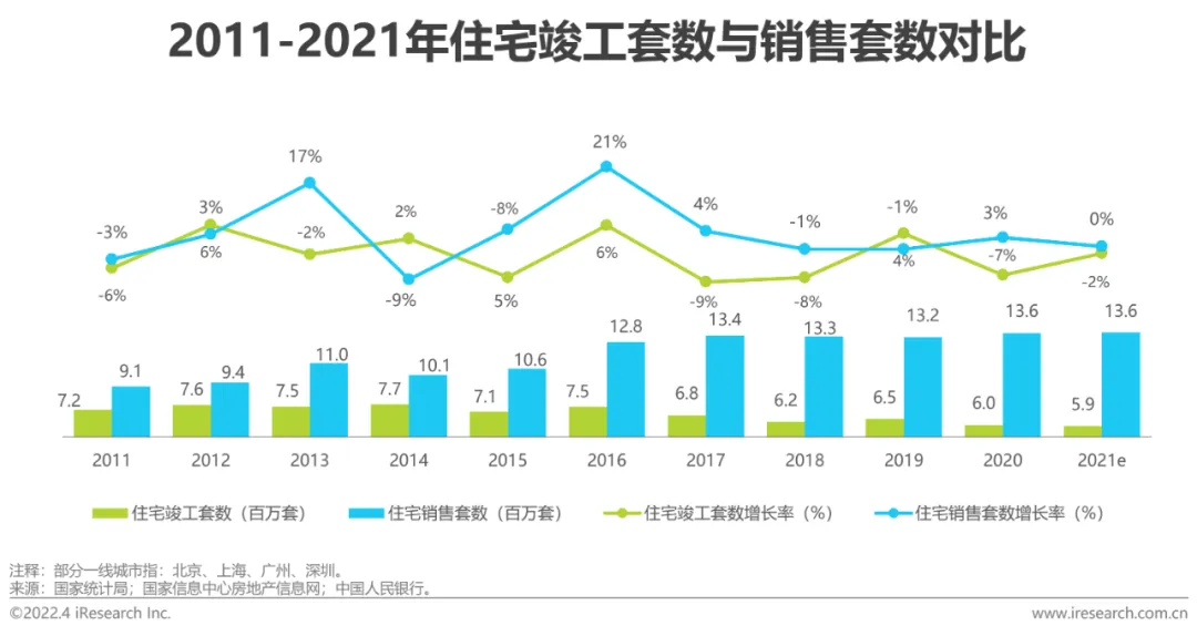 新房家装的市场空间有限。从住宅库存来看,近十年来我国住宅竣工套数年增长率总体为负(2011-2021年增长率为-2.3%),2020年住宅竣工套数环比下降了7%,住宅新房库存增量持续走低。从住宅销售来看,2015-2017年住宅销售数经历了较大幅度的增长,近年维持约1350万套的稳定水平,销售套数增速较低。据央行调查,中国2019年城镇居民户住房拥有率96%,购房刚需空间见顶。