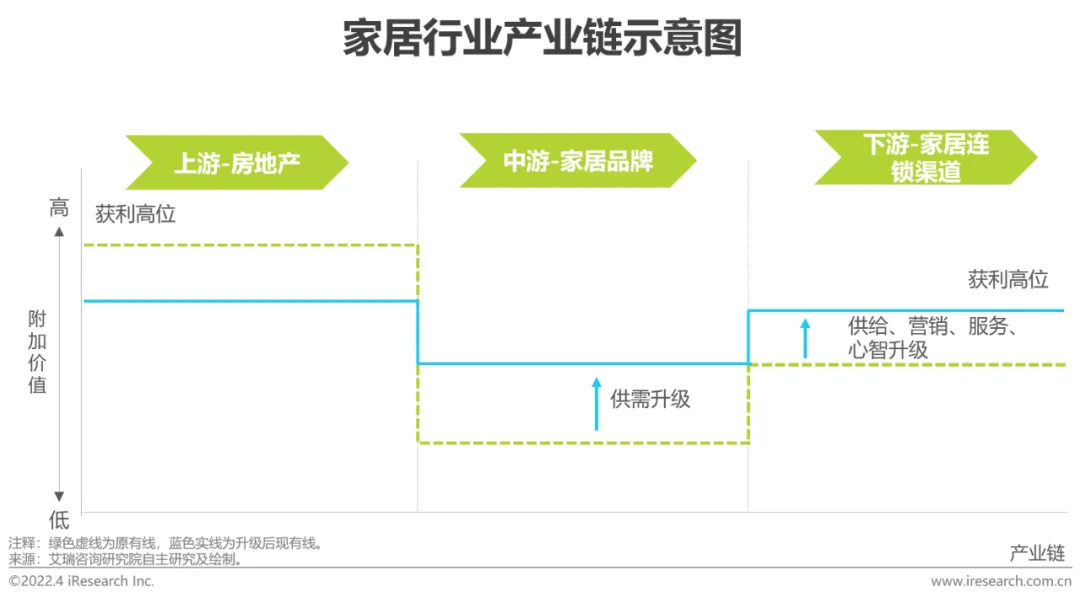 家居产业链上游的变化为其带来新的增长点,中下游玩家通过创新创意和品牌服务获取高附加值,品牌间竞争激烈。