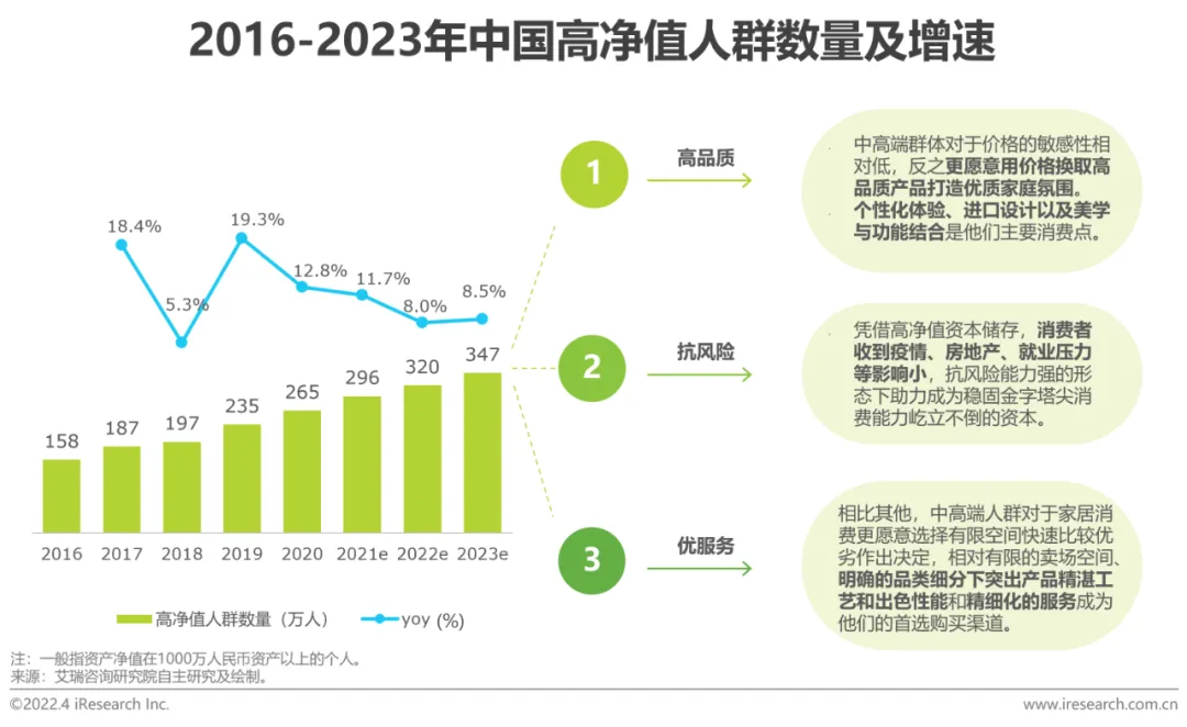 中高端消费群体尽管在全国占比不大,但在许多高线城市分布广泛,超过三成高净值人群汇聚广东、上海、北京等地,2016-2021年高净值人群年复合增长率高达13.3%,预计2023年中国高净值群体接近350万人。