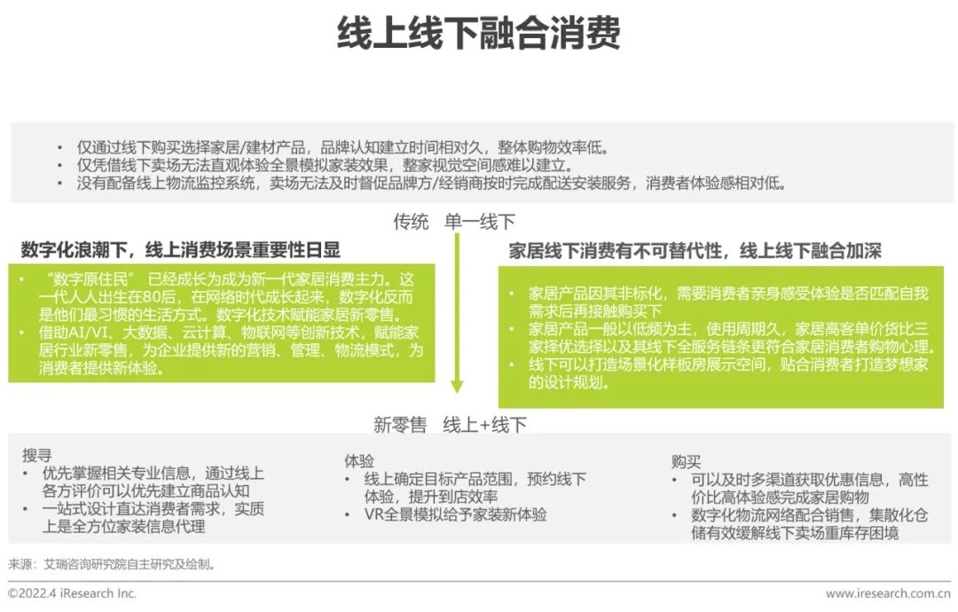 家居传统零售模式以线下场景为主,消费者前往实体卖场挑选,线下体验,线下购买。但新一代消费人群在数字化浪潮下消费习惯变化,线上消费场景重要地位日益显著。同时,家居行业有着极强的线下固有属性,线下不可完全被线上替代。因此家居新零售需要线上线下互补融合,在数字化浪潮下创新消费场景。