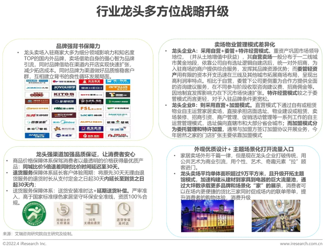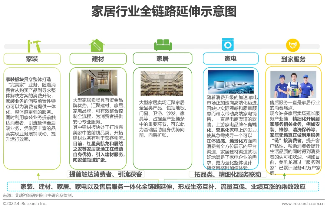 家居卖场扩张业务版图,横跨家装、建材、家居家具、家电及后期到家服务,打造全链条联动型生态布局,创造新的增长点。前端:借助自身优势向家装建材扩张,在装修起始点便触达消费者,增加获客,带动家居业务的协同发展;后端:消费者对家电的需求不仅局限于单个的家电,是希望获得更高端的系统化家电解决方案,家居商场可以引入高端家电品类为消费者提供更加一体化全链条的服务, 处于消费链前端的家居建材渠道能有效地集中目标消费群体,在品类、品牌之间相互引流,提升整体平均客单价,坪效更高。家居卖场紧随消费需求变化向家电拓品类纵深发展,同步为消费者提供到家服务,例如安装清洗家电等,实现一体化全链条服务。