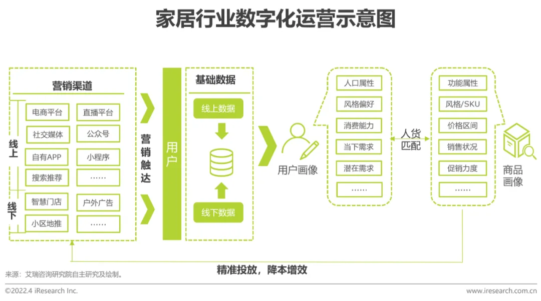 在数字化浪潮下,家居行业顺应趋势不断提升数字化水平。通过搜索推荐、电商平台、直播平台等线上渠道触达消费者,提供优惠券刺激消费,同时获得用户信息,进行后期回访,提高转化率;通过小区地推、智慧门店等线下方式触达消费者,借助社群运营进行用户互动及资源投放,进行消费引导,提升用户粘性。
