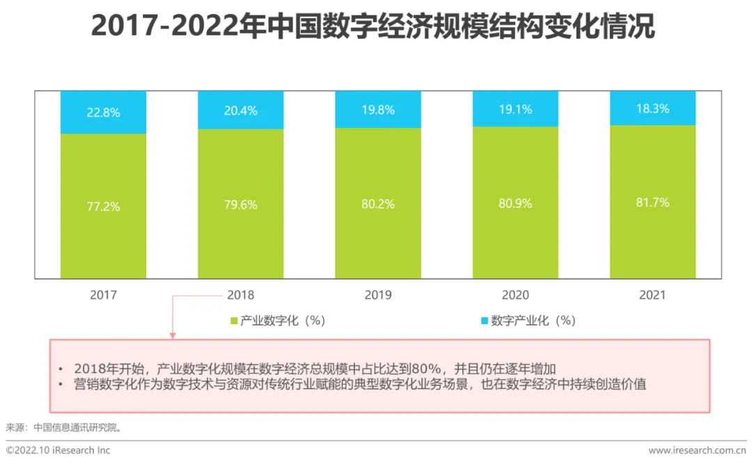 据中国信通院数据显示,2021年中国数字经济规模已达45.5万亿,其中产业数字化的规模贡献占比为81.7%。从历年数据可以发现,中国数字经济发展未来增长动力主要还是在传统产业数字化转型后激发出的新商业价值,而营销业务场景的数字化也是企业整体数字化战略中的不可或缺的一环。