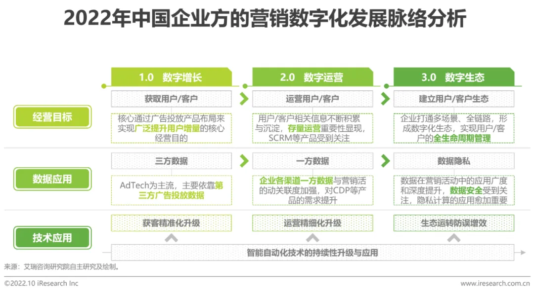 中国企业方对营销数字化的探索脉络或思维落点可被划分为数字增长、数字运营和数字生态三个阶段。1)在数字增长阶段中,企业的经营目标聚焦于获取尽可能多的增量用户/客户,该阶段的营销数字化也核心围绕AdTech与第三方广告投放数据开展。2)随着增量空间的缩减以及企业对自身用户/客户数据资产的积累,数字运营阶段到来,数字化营销活动对企业各渠道一方数据的依赖度提升,能够对多渠道用户/客户数据进行有效整合的CDP,以及能够系统化触达存量用户/客户的SCRM受到企业关注。3)现阶段,中国企业方的营销数字化探索正朝着数字生态阶段迈进,多场景、全链路的数字化应用成为核心目标,用户/客户相关数据在营销活动中的应用广度和深度也将进一步提升,企业内部数字化生态的高效运转以及对数据的合规化、安全化使用成为企业的布局关注点。