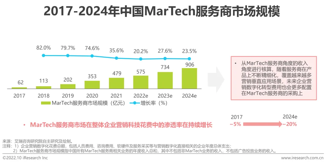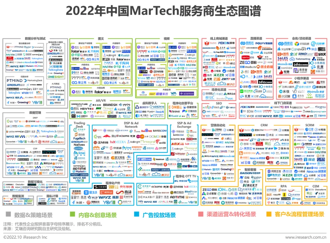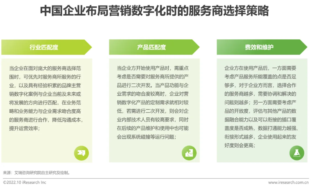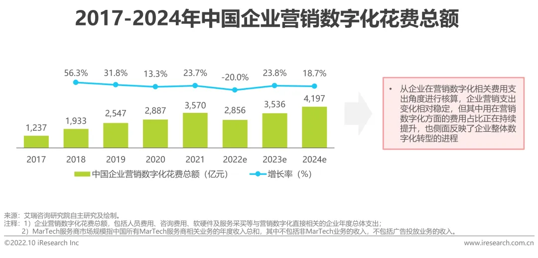 营销数字化是企业整体数字化转型进程中的重要业务转型场景,企业也在不断加大营销数字化相关预算投入。除了2022年受疫情和经济环境影响,企业整体预算缩减,预计营销数字化相关费用也会暂时下降之外,艾瑞对更加长期的营销数字化投入仍持乐观态度。而随着MarTech服务商市场的不断成熟,产品和服务也愈加精细和落地,企业在营销数字化的预算增量也是越来越多向MarTech服务商的服务与产品采购倾斜。