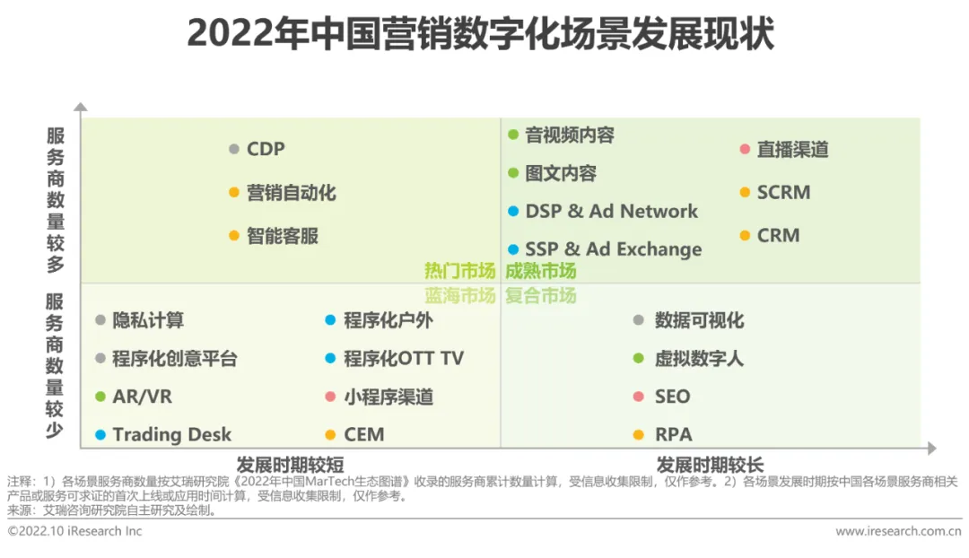 根据当前中国营销数字化细分场景的服务商数量与发展时期分布情况,较多细分场景的服务商数量仍较少,企业方需求的可激发空间与服务商的发展空间大。如蓝海市场中的隐私计算、AR/VR等细分场景在《个人信息保护法》推行、元宇宙发展的推动下,预计将获得更高市场关注;同时,复合市场中的虚拟数字人、RPA等细分场景的出现时间虽不短,但随着元宇宙关注度的提升、AI技术的不断强化,在现阶段才迎来逐渐成熟的市场发展时机,可同样视为发展潜力较大的蓝海市场。而CDP、营销自动化、智能客服等场景则在相对较短的发展时间中快速涌现出了数量较多的服务商,成为当前阶段的热门市场,也从侧面体现出对用户或客户的精细化、智能化运营成为存量市场中企业方的核心关注方向与需求热点。