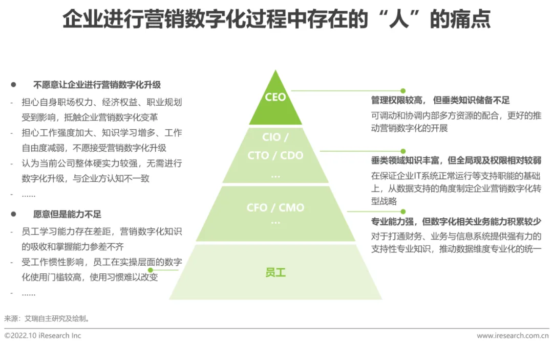 企业的营销数字化是一个自上而下推动的长久性的团队合作,在转型过程中领导层对营销数字化理解的深入程度不同,不同层级对MarTech场景和程度的迫切性和必要性感知不同,同时一线员工的主观意愿和接受程度参差不齐,难以对企业的营销数字化建立统一的认知。