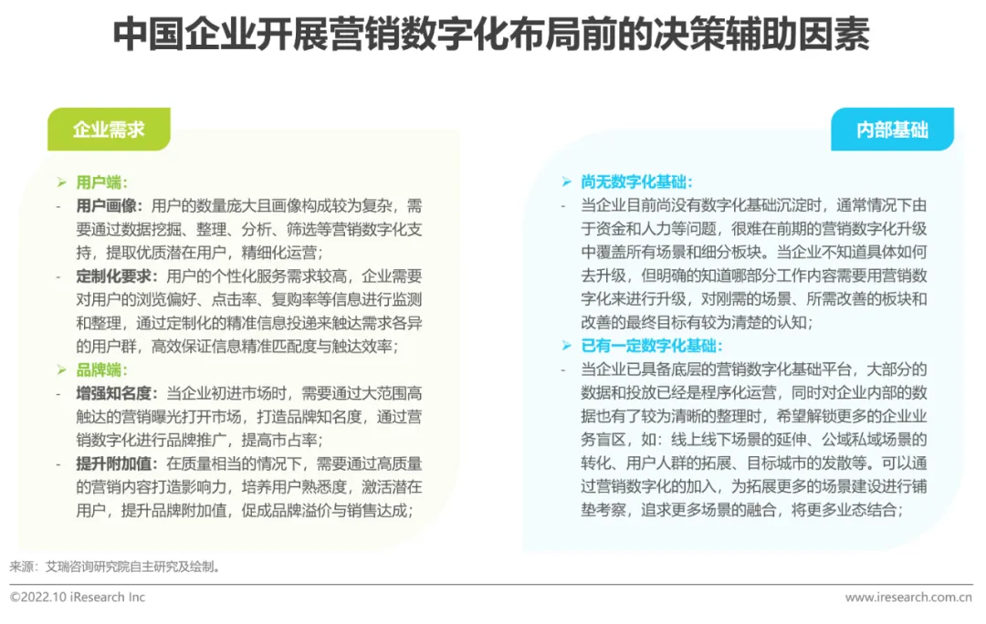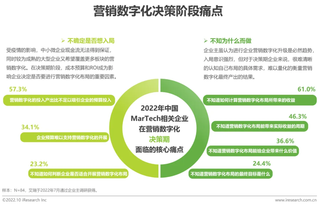 在通信设施和移动互联网高速发展的助力下,社媒平台的丰富和大数据精准度的提升促使当下用户的生活消费习惯及网络浏览习惯升级,企业的规模化精准数字化营销愈发重要,企业纷纷入局MarTech。对于尚未开展营销数字化布局的企业来说,在决策期企业主要面临两方面问题,一方面不知道是否该入局,另一方面不能清楚的认知自己的直接需求。