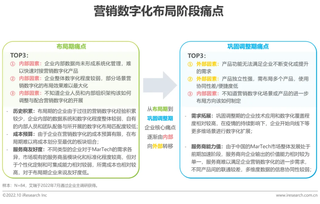 对于营销数字化布局期的企业来说,核心痛点主要来源于企业内部调整,为避免营销数字化效果与自身业务结合的偏差较大,从人力资源到数据业务的贯连式持续性整合管理起到了至关重要的把控作用;同时,目前市场上丰富的垂类领域服务商细分度和相似度较高,也同步加大了企业方的选择难度。而随着企业营销数字化的愈发成熟和MarTech市场的新一轮洗牌,产品和赛道的技术壁垒逐渐打破,成熟布局期的企业开始向更深层次的垂类领域进行挖掘,企业对于服务商的技术和融合等能力要求提升,全局深度布局方案制定的难度提高,核心痛点逐渐偏向外部服务商的价值能力提供。