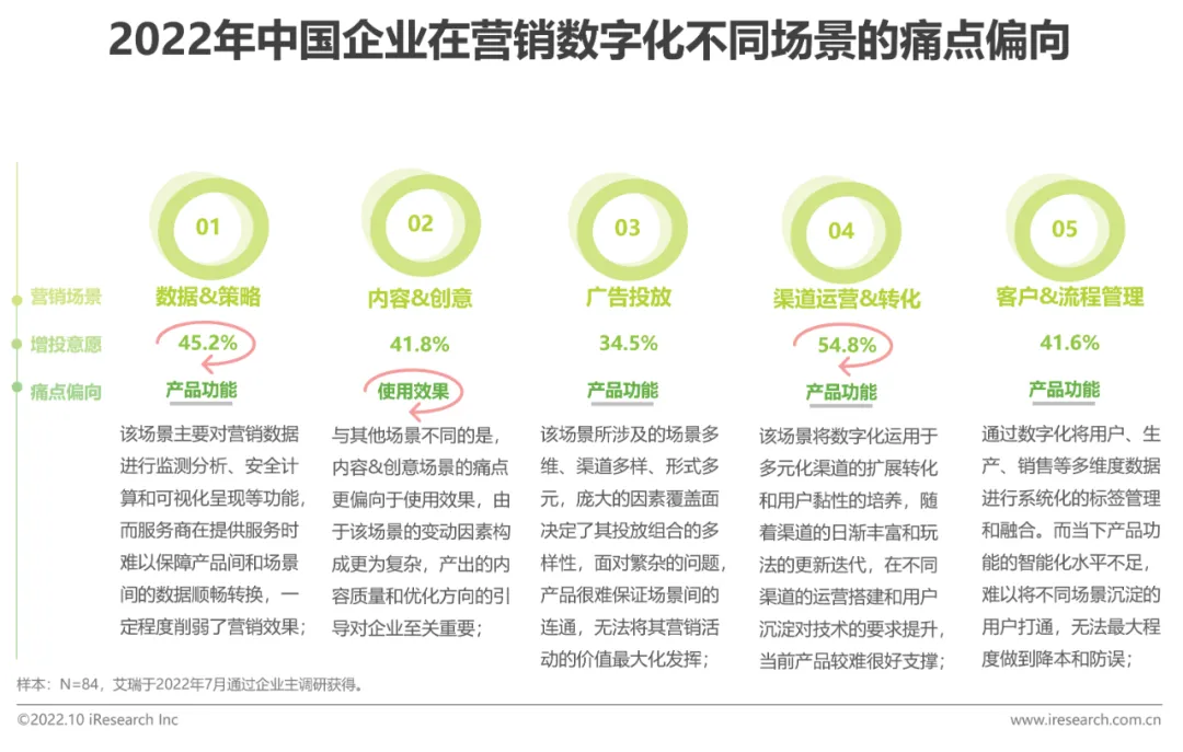 从企业营销数字化的不同场景来看,虽然互联网的高速发展为中国MarTech市场提供了成熟的土壤,但互联网企业也在同步迅速成长,当下市场服务商提供的产品支持与企业方实际需求存在偏差,供需难以平衡,企业的核心痛点在大部分场景中仍聚焦于产品功能的不满足;同时,随着社媒和营销渠道的迅速成长,作为其他场景数字化运作基础的数据和策略场景和作为营销转化重要承载力量的渠道运营和转化场景成为企业方增投意愿最强的两大场景。