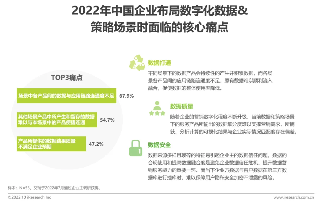 企业在数据和策略场景的主要需求一部分在于不同场景下用户数据信息的覆盖度与细分度,另一部分在于营销活动的效果监测与制定,在对数据捕获整合后进行可视化呈现。由于数据从验证分析到管理监测,需要跨越多种数据产品涉及环节众多,随着企业方的智能化程度加深,对数字化场景下的高精准度、高效率、高整合能力需求提升,而当下数据和策略场景的使用效果难以达到预期。