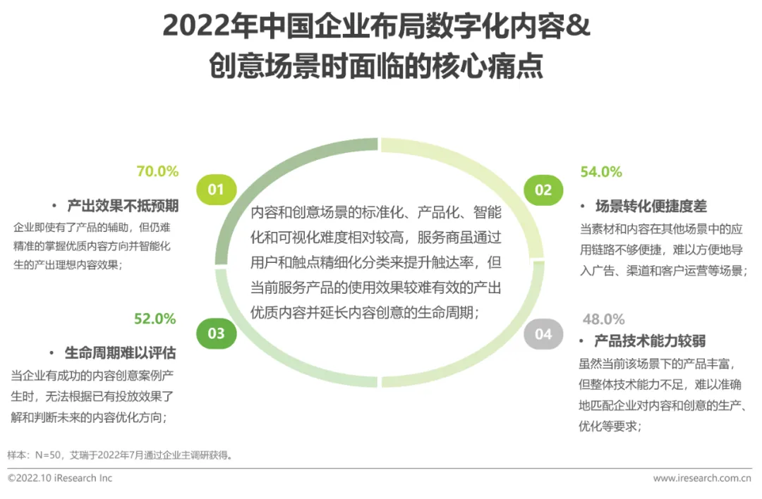 随着短视频和内容社交平台逐渐成为用户流量的高密度聚集地,企业对用户流量的竞争日趋激烈,同时内容生态的成熟将用户对所产出广告的内容和创意质量期待值提升,企业需产出差异化内容吸引目标用户和潜在客群。营销数字化布局下的内容和创意场景智能化的对内容创意进行产出、调整和重组,虽然一定程度上简化了繁琐的沟通流程,降低人力精力财力和试错成本,但企业的智能化定制需求和可量化的数据优化能力在当前的数字化内容和创意场景较难满足 。