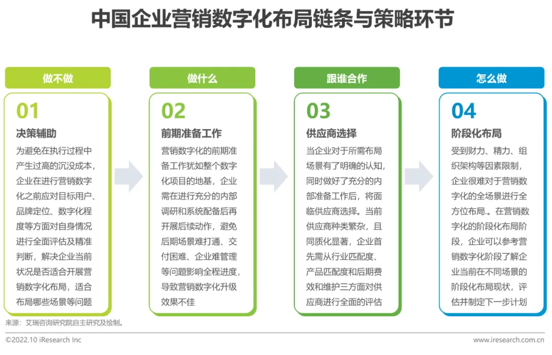 为确保企业营销数字化的进程顺利开展,无论是小微型企业还是中大型企业,在营销数字化转型升级的过程中,都需要从开展前期的决策辅助、内部准备工作、开展中的供应商匹配和阶段化战略布局四个方面进行完善的调研与规划,将数字化进程与企业业务板块相结合,在简化企业管理的同时拓展业务领域。