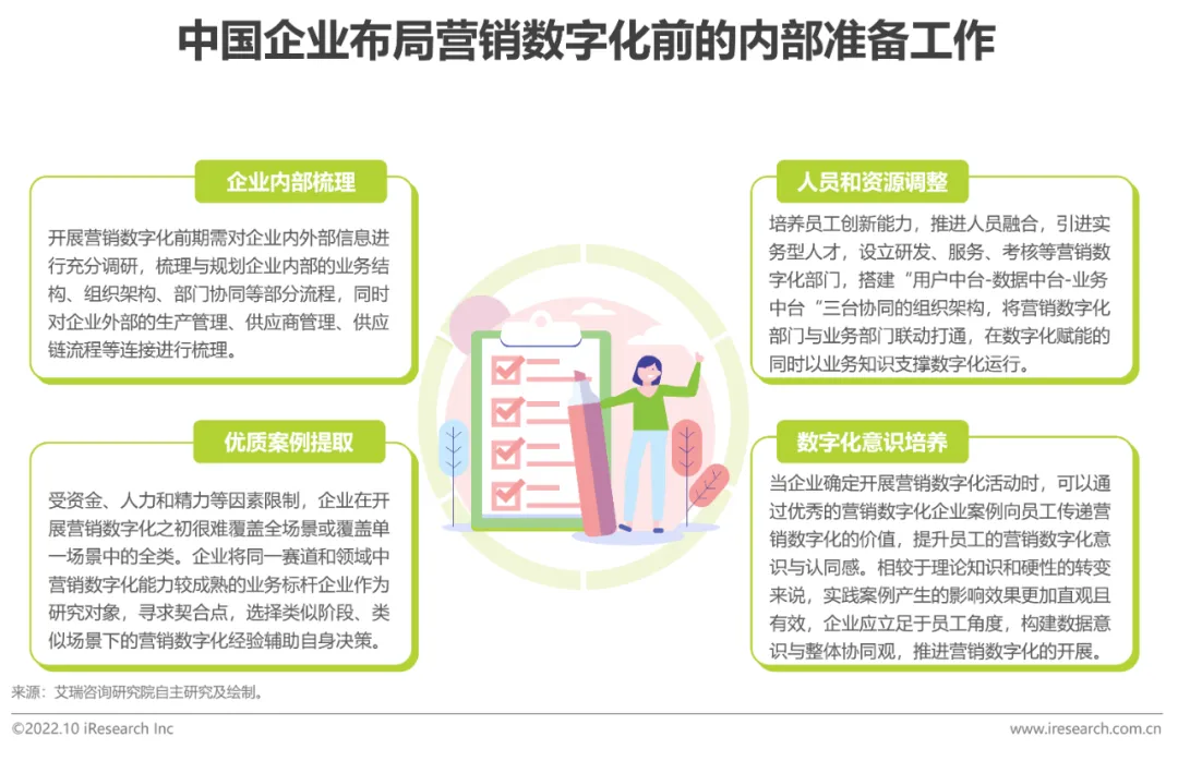 企业在营销数字化前期进行的内部准备工作为企业制定完善的营销数字化解决方案,确认后续系统开发、人员管理、部门调整、绩效核定等方面的营销数字化规划进行了信息铺垫。使企业在数字化战略布局相应的流程和场景中,加强技术沉淀,积累数字化资产和能力,将营销数字化融合贯穿于企业组织架构,统一数字化营销战略,实现新的营销方式。