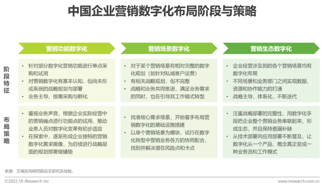 企业营销数字化不是一个布局动作,而是一个持续的经营过程。因此,企业进入到落地的执行环节后,不必急功近利无视企业实际业务现状,短时间做大规模的投入和铺陈,也要避免过度放养完全脱离战略目标与规划,不着边际的进行采购与试点。通常来说,营销数字化演进基本会经历营销功能、营销场景和营销生态三个数字化阶段,企业需要洞察自身当前所处的营销数字化阶段,以及结合自身整体数字化战略和实际业务经营情况,来合理进行阶段式的规划与推进。