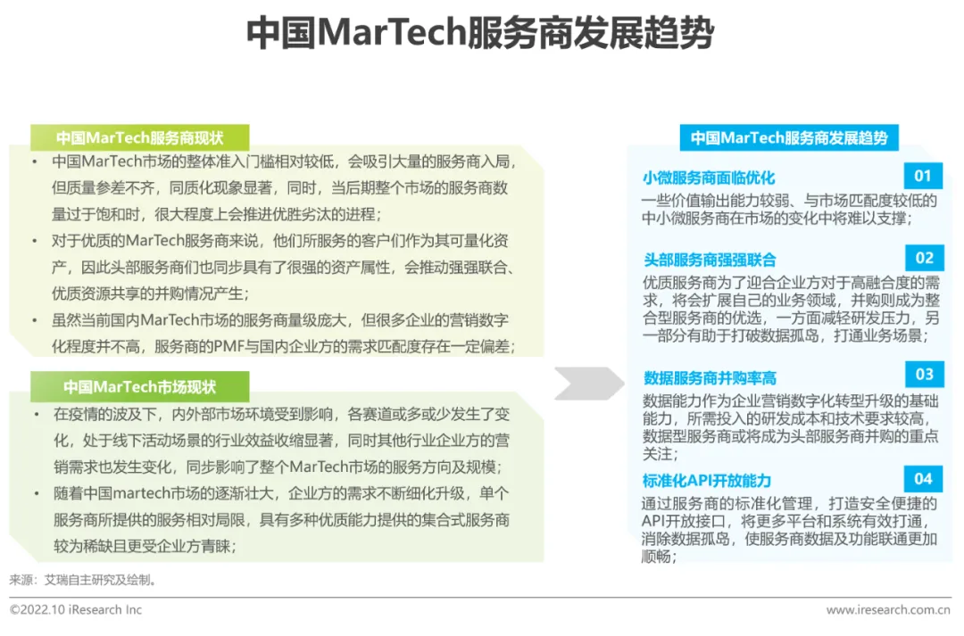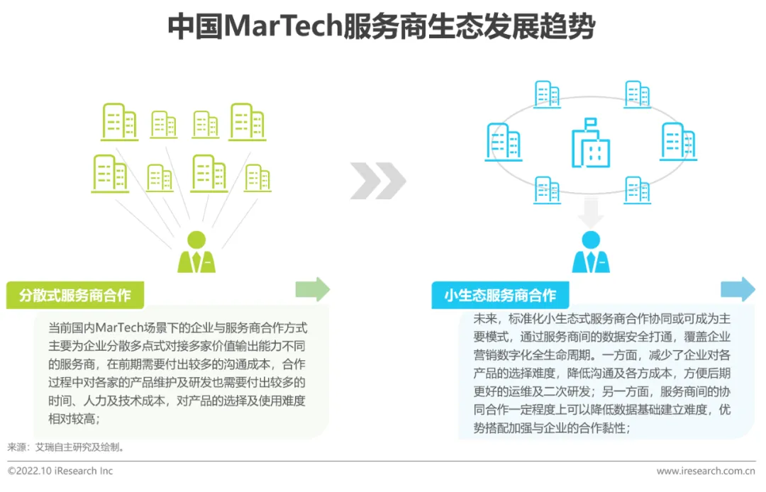 随着中国MarTech行业的不断发展,大批量服务商入局其中,头部服务商迅速成长,但用户端数据、业务端数据、场景端数据、分平台数据等打通难度较大,数据孤岛现象仍较为显著。同时,随着行业生命周期的变化,价值输出能力单一的中小微企业消退,整合型高赋能头部服务商逐渐壮大将成为必然趋势,国内MarTech行业将面临新一轮变动洗牌。
